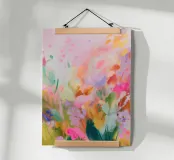 Il motivo mostra una composizione floreale dinamica e astratta, dai colori pastello decisi ma delicati. Pennellate di rosa, arancione e verde formano una moderna interpretazione di un prato fiorito estivo. La pittura conferisce all'opera profondità, leggerezza e un'aura naturale e vivace.