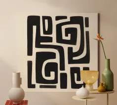 Quest'opera attira lo sguardo in una danza ipnotica di forme nere! Linee spesse e curve e spirali si fondono in un labirinto dinamico su uno sfondo color crema: un gioco di positivo e negativo, movimento e calma. Lo stile è un puro minimalismo organico con pennellate espressive, influenzato dalle silhouette di Matisse e dalla potenza grafica della modernità di metà secolo. Il dipinto crea una profondità meditativa, suscita curiosità ed equilibrio interiore, permettendo allo spettatore di sprofondare nella contemplazione. Per ambienti che richiedono elegante raffinatezza e chiarezza spirituale.