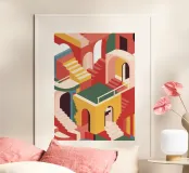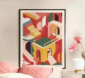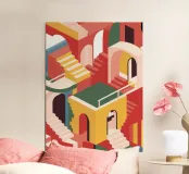 Un complesso e impossibile labirinto architettonico di scale, archi e porte dai colori vivaci.