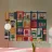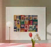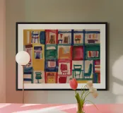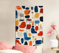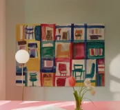 Una griglia vivace di sedie e scaffali colorati dipinge un interno astratto di ricordi stratificati e ordine giocoso.