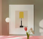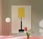 Una bella e stilizzata rappresentazione minimalista di una lampada da terra, che incarna le linee pulite e l'estetica funzionalista del movimento di design Bauhaus. La lampada è caratterizzata da un'alta base geometrica nera e da un supporto, coronato da un paralume cilindrico dominante in un audace giallo solare. La composizione semplice ed elegante su uno sfondo chiaro e neutro evidenzia la purezza della forma. La parola "BAUHAUS" è sottilmente integrata alla base. Questo file di arte digitale di alta qualità (7000x5000 pixel, 300 dpi) è perfetto per la stampa di alta qualità e per aggiungere un tocco di eleganza Mid-Century Modern a qualsiasi ambiente.