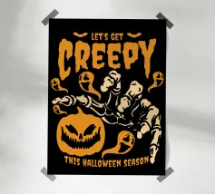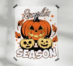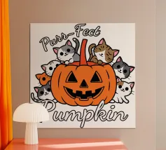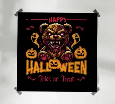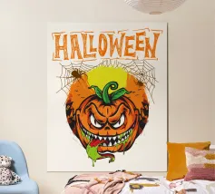 Due zucche maliziose con ghigni minacciosi. La frase "Let's put a smile on that face" (mettiamo un sorriso su quella faccia) è riportata in grassetto, a caratteri scherzosi.