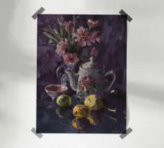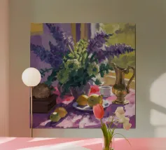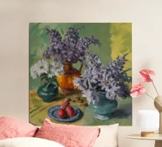Una natura morta con una brocca d'argento riempita con un rigoglioso bouquet di lillà viola e rosa. Un bicchiere di vino rosso e della frutta si trovano su una superficie scura e lucida che riflette gli oggetti.