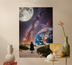 Non si può aver amato e dimenticare. ~ Donna con cappotto rosso che guarda un pianeta gigante in piedi in un paesaggio futuristico surreale, elementi di architettura floreale retrò.
