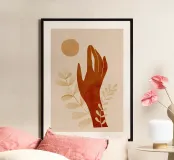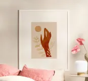 Illustrazione minimalista dai toni caldi della terra. Una mano stilizzata si protende verso il sole, mentre le foglie morbide sullo sfondo aggiungono un senso di equilibrio e natura. L'opera d'arte trasmette semplicità, serenità e una tranquilla connessione con il mondo naturale.