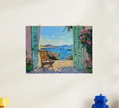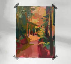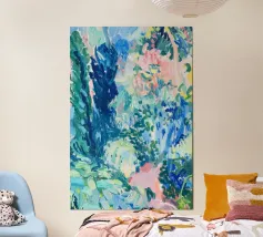 Un sentiero che attraversa un giardino all'inglese, circondato da una vegetazione vivace e da fiori sbocciati nei toni del rosa, del viola, del blu, del giallo e del verde acqua, dipinti con audaci pennellate di pittura acrilica, creando una scena vibrante e colorata che ricorda lo stile di Matisse. I colori sono brillanti e saturi e aggiungono profondità alla composizione, mentre le ombre morbide aggiungono dimensione a elementi come alberi, fogliame, cespugli e rocce. Questo dipinto evoca gioia e giocosità, creando un effetto allegro.