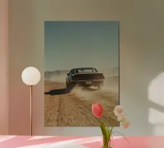 Una ripresa cinematografica perfettamente composta di una Ford Mustang Fastback nera opaca che solleva la polvere mentre sfreccia su un'autostrada deserta illuminata dal sole. Il bagliore dorato del tramonto contrasta con la vernice nera profonda, enfatizzando le linee eleganti e aggressive di questa leggendaria muscle car. I larghi pneumatici della Mustang aderiscono alla strada accidentata mentre il suo motore V8 ruggisce, emanando una potenza grezza che definisce l'essenza della cultura automobilistica americana. Il paesaggio circostante, fatto di sabbia e montagne lontane, contribuisce a creare un'atmosfera selvaggia e libera.