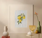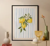 Un poster elegante e rinfrescante con un'illustrazione dettagliata ad acquerello di un ramo di limone fresco, completo di tre limoni giallo brillante, foglie verdi e delicati fiori di limone bianchi. Il bellissimo gruppo botanico è collocato su uno sfondo dinamico e massimalista a strisce verticali bianche e blu chiaro, il tutto reso con una finitura pittorica morbida e strutturata. La composizione è sofisticata ed evoca la serena eleganza della costa mediterranea. Questo poster digitale di qualità superiore (7000x5000 pixel, 300 dpi) garantisce i colori ricchi e sfumati della frutta e dei fiori acquerellati, così come i colori della frutta e dei fiori.