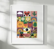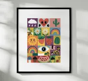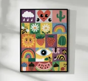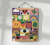 Un motivo allegro e giocoso di varie icone simpatiche e colorate, tra cui arcobaleni, cactus, occhi e frutta. Il mix eclettico crea un disegno divertente, energico e stravagante.