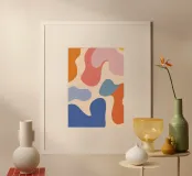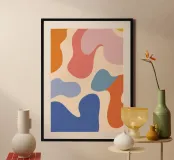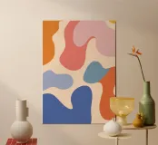 Un'armoniosa composizione astratta di forme organiche sovrapposte in una morbida e calda tavolozza di colori pastello. L'opera d'arte è delicata e moderna, con una qualità ritmica e rilassante.