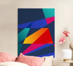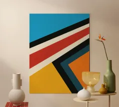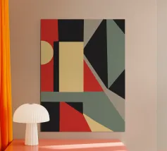 Forme geometriche astratte formano una composizione con audaci linee diagonali che si intersecano in vari angoli. La tavolozza è composta da toni tenui, tra cui nero, grigio, beige e ruggine.