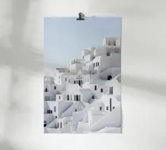 Minimal white Greek building with blue gate in Santorini carta hahnemühle