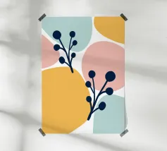 Un disegno botanico minimalista presenta un ramo bianco delineato con foglie. Linee curve e forme organiche nei toni del blu, del verde e del giallo creano uno sfondo moderno e astratto.