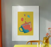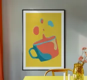 Una vibrante collisione di colori e forme, questa opera d'arte digitale minimalista cattura il caos giocoso di una tazza inclinata a metà. Su uno sfondo giallo dopamina, il design ispirato alla pop-art mescola corallo, verde acqua e toni pastello in un pezzo visivamente incisivo, ideale per dare energia a cucine moderne, angoli caffè o spazi creativi eccentrici.