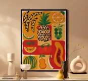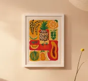 Una composizione vivace e generosa di vari frutti tropicali stilizzati come ananas, papaya e anguria. L'opera d'arte è una celebrazione colorata e gioiosa delle dolci offerte esotiche della natura.