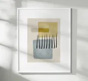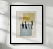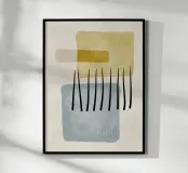 Arte digitale astratta con linee, forme organiche e geometriche con texture e pennellate nere in morbide tonalità pastello di marrone, ocra, blu e beige. Arte moderna per interni essenziali, scandinavi, bohémien e boho. Godetevi l'arte digitale minimalista con forme e linee morbide.