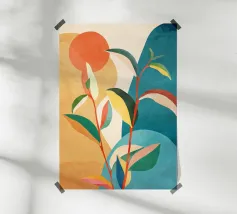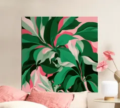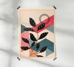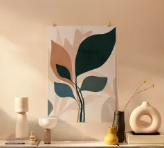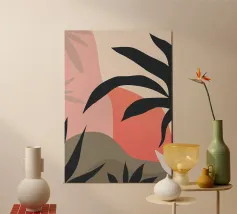 Forme botaniche astratte, tra cui foglie e steli nei toni del rosa, del viola, del blu e del beige, sono disposte su uno sfondo scuro. La composizione è elegante e moderna, incentrata su forme organiche e giochi di colore.