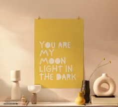 Scoprite il poster motivante "MOIN - DU PACKST DAS". Questo design creativo ed energico combina una tipografia semplice con un messaggio positivo. Su uno sfondo giallo caldo, la scritta "MO IN" spicca in caratteri maiuscoli bianchi e decisi. Direttamente sotto di essa, "DU PACKST DAS" è disposta in una linea curva e semicircolare che ricorda visivamente un sorriso.