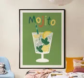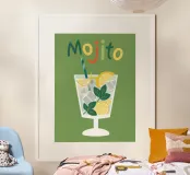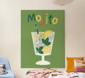 Un'illustrazione grafica brillante e vivace di un cocktail mojito in un bicchiere, con la tipografia 'Mojito' in alto, su un vivace sfondo verde lime.