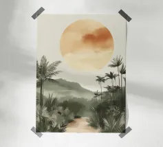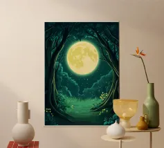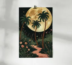 Un'ipnotica scena notturna con palme lussureggianti immerse nel bagliore di una luna piena sovradimensionata. Il verde intenso contrasta meravigliosamente con il cielo notturno, mentre i fiori delicati sbocciano sotto la luce celeste. La scena cattura una qualità onirica, fondendo la bellezza naturale con un'atmosfera eterea, quasi surreale. I toni caldi della luna creano un contrasto sorprendente con i verdi profondi e i rosa tenui dell'ambiente floreale. Quest'opera d'arte evoca tranquillità e meraviglia, rendendola un pezzo ideale per gli amanti dei paesaggi celesti.