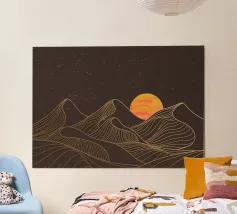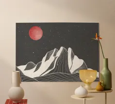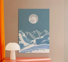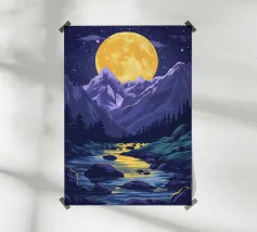 Questa stampa in bianco e nero in stile linoleografia ritrae un ipnotico paesaggio notturno. Una luna piena splendente domina il cielo stellato, proiettando la luce su un fiume tortuoso che scorre tra montagne aspre e strutturate. L'intricato lavoro al tratto crea un senso di movimento e profondità, evocando mistero e tranquillità.