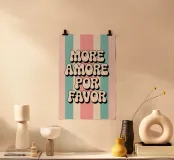 Poster vettoriale retro groovy con la scritta "More Amore Por Favor". Sfondo a strisce in rosa pastello, blu e crema, abbinato a una tipografia anni '70 per un design retrò giocoso e colorato.