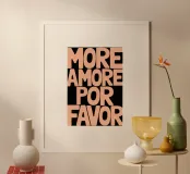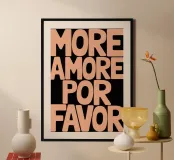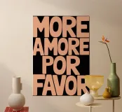 Design tipografico con la scritta "MORE AMORE POR FAVOR" in grandi lettere maiuscole color pesca su sfondo nero. Impilate verticalmente, le lettere chiare e sans-serif creano una dichiarazione moderna, accattivante ed elegante.