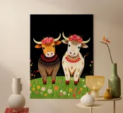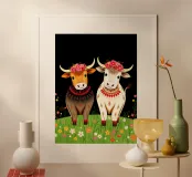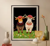 Simpatiche mucche scozzesi stravaganti in un prato selvaggio con copricapi floreali.