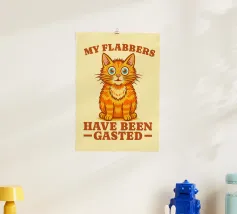 Un gatto cartoon con un'espressione sorpresa è circondato dalla frase umoristica "My Flabbers Have Been Gasted" (Le mie chiappe sono state gonfiate) in grassetto, a caratteri arancioni.