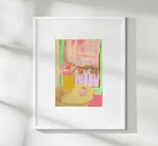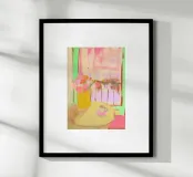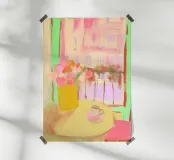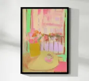 Natura morta colorata con un tavolo rotondo, un vaso giallo con fiori rosa, arancioni e bianchi a sinistra, una tazza bianca su un piattino a destra e una sedia rosa in primo piano. Sfondo di pennellate rosa-viola su una parete giallo chiaro, cornici di finestre parzialmente visibili.