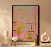 Natura morta colorata con vaso giallo pieno di fiori rosa e gialli, un libro rosa, tazza gialla su piattino sul tavolo. Sfondo con parete rosa, strisce verticali, parete verde chiaro e ringhiera rosa. Design moderno, decorativo e armonioso.