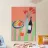 Natura morta colorata su un tavolo a righe rosa e verdi con vaso azzurro e fiori rossi, bottiglia scura con etichetta bianca, piatto con banane e arancia e bicchierino con bevanda rossa. Lo sfondo color pesca sottolinea l'armonia della composizione artistica.