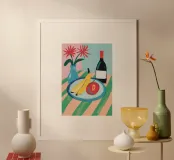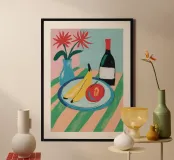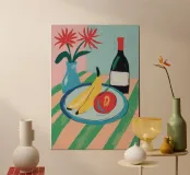 Natura morta colorata su un tavolo a righe con un piatto blu, una banana gialla e un pomodoro rosso. Vaso blu con fiori rossi e bottiglia scura con etichetta bianca. Sfondo rosa e azzurro, colori vivaci e forme chiare creano un'opera artistica e armoniosa.