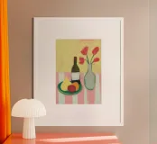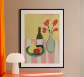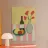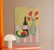 Natura morta colorata con un vaso turchese chiaro e quattro tulipani rossi con steli verdi. Accanto, un piatto verde con una pera gialla, una mela rossa e un'arancia. Lo sfondo giallo con strisce rosa in basso crea armonia e profondità artistica.