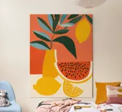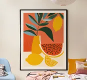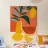 Un'esuberante natura morta piena di luminosità mediterranea! Questa potente composizione combina limoni stilizzati, un'anguria a fette e foglie verde scuro in un vaso giallo su uno sfondo rosso corallo brillante. Lo stile combina la chiarezza decorativa di Matisse con l'estetica del design piatto di tendenza. Le forme ridotte e la palette di colori giallo, arancione e verde emanano pura energia estiva. La precisione grafica - dai semi di anguria alla fetta d'arancia - dimostra maestria e finezza. Un'opera ottimista che riempie gli ambienti di gioia di vivere meridionale.