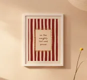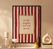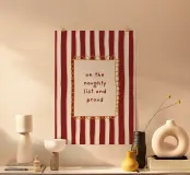 Aggiungete un po' di umorismo impertinente alle vostre vacanze con questo poster tipografico giocoso. L'audace affermazione "sulla lista dei cattivi e orgoglioso" è riportata in un affascinante stile letterato a mano all'interno di una cornice smerlata color avorio. Lo sfondo è caratterizzato da suggestive strisce verticali rosse e crema, che conferiscono all'opera un'estetica vibrante e retrò da carnevale o da bastoncino di zucchero. Questa stampa d'arte è perfetta per chi ama un po' di irriverenza e divertimento durante il periodo natalizio. Scaricate questo file digitale di qualità superiore, 7000×5000 pixel, 300 dpi, per un pezzo di arte digitale eccellente e di alta qualità.