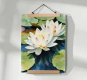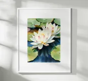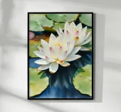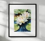 Questo elegante e sereno acquerello cattura la delicata bellezza di due ninfee bianche e rosa che galleggiano pacificamente su uno stagno blu intenso. I petali morbidi e stratificati dei fiori sono messi in risalto dalla calda luce del sole, proiettando ombre delicate che creano un senso di profondità e tranquillità. Le ninfee verdi circondano i fiori e i loro riflessi scintillano sulla superficie dell'acqua calma. Questo pezzo evoca una sensazione di pace e armonia naturale, rendendolo un'aggiunta perfetta a qualsiasi spazio che cerchi un tocco di calma ed eleganza naturale.