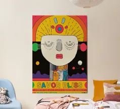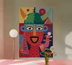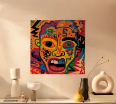 Un volto astratto con occhi a forma di X e una bolla che recita "Non aspettarti mai nulla". I ghirigori e le frasi stratificate generano una narrazione visiva che fa riflettere.
