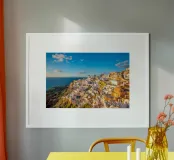 Il sole tardivo illumina Oia di una luce calda, mentre i mulini a vento si ergono sopra le facciate bianche. Il villaggio sulla scogliera si affaccia sull'Egeo e la caldera si apre su un orizzonte azzurro. Una vista luminosa e ariosa che bilancia il bagliore dorato e il mare fresco.