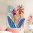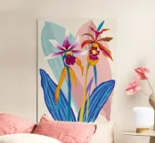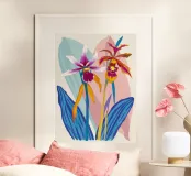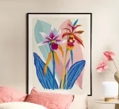 Un'illustrazione splendidamente dettagliata cattura l'eleganza di un'orchidea in fiore, con vibranti petali rosa, bianchi e gialli contrapposti a foglie blu intenso.
