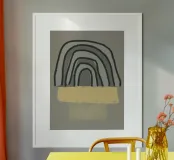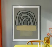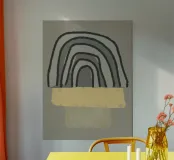 Opera d'arte astratta e moderna con forme organiche e geometriche e pennellate in verde, giallo e nero. Con sottili texture vintage, crea un aspetto e un'atmosfera retrò. Moderno, retrò, countryside, new countryside, natural living, bohémien e scandinavo.