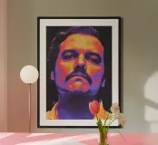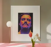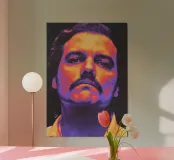Un uomo dall'aspetto serio con i baffi, illuminato con audaci tonalità viola e arancioni.
