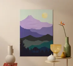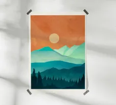 La silhouette di una catena montuosa si staglia su un cielo rosso e arancione, creando un contrasto sorprendente. I toni verdi e neri delle montagne suggeriscono una scena suggestiva al crepuscolo o all'alba.