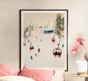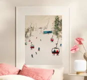 Un vivace motivo invernale: gli sciatori scivolano sulla pista mentre gli impianti di risalita rossi fluttuano nel paesaggio innevato. Con i suoi colori chiari e lo stile moderno, questo disegno porta il dinamismo sportivo e il fascino alpino in ogni casa. Perfetto per murales, tazze, cuscini o tessuti: un regalo ideale per gli appassionati di sci e gli amanti dell'inverno.