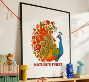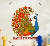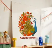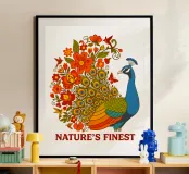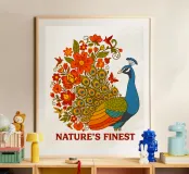 Una lussureggiante illustrazione di un pavone e di un bouquet di fiori rosso-arancio. Una tavolozza calda ed estiva, ideale per creare un'atmosfera botanica e di tendenza nella vostra casa.