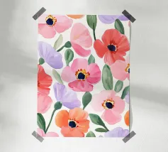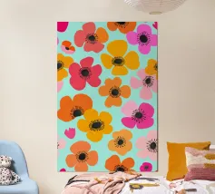 Audace, bellissimo e allegro motivo floreale caratterizzato da vivaci papaveri rosa, rossi e arancioni accentati da dettagli blu scuro e gialli con foglie color senape/ocra su un morbido sfondo rosa pastello.