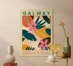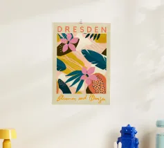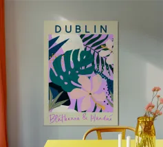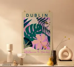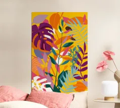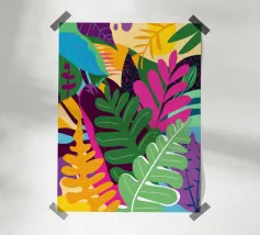 Una lussureggiante scena di giungla incornicia un grappolo d'uva viola, creando una natura morta unica e inaspettata che fonde il fogliame tropicale con la frutta del frutteto in una composizione vibrante.