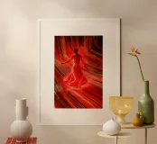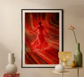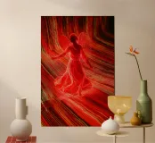 Questo motivo è uno straordinario esempio di arte digitale che utilizza il light painting e crea un'atmosfera mistica, quasi trascendentale. La figura dell'angelo, disegnata in una luce rossa incandescente, sembra muoversi in un flusso di linee ondulate che ricordano l'oro liquido e la lava incandescente. L'opera gioca magistralmente con gli effetti visivi del bagliore e del movimento in un'estetica futuristica. È un'immagine affascinante che trasporta l'osservatore in un'altra dimensione e porta una potente energia eterea nella stanza.
