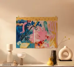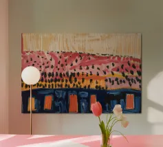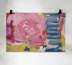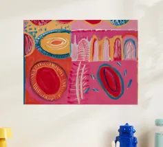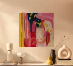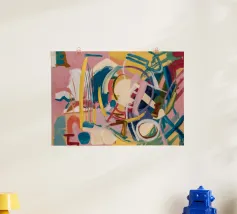 Un patchwork di motivi diversi, tra cui linee e forme a U, nei vivaci colori giallo, blu, rosa e rosso, crea un colorato effetto mosaico in questo pezzo astratto.