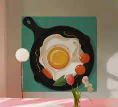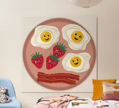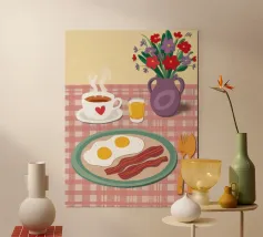 Un'illustrazione semplice e appetitosa di un classico piatto da colazione con un uovo perfettamente fritto, bacon croccante e una fetta di pomodoro su pane tostato.
